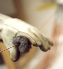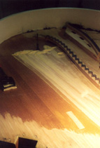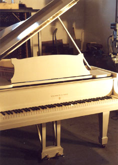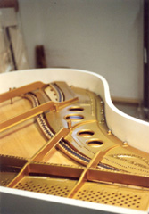 On ponce alors finement la table, puis l'instrument est préparé pour le giclage du nouveau vernis de la table d'harmonie, et, une fois celui-ci effectué, préparé à nouveau pour le giclage en blanc de l'intérieur de la ceinture du meuble.
